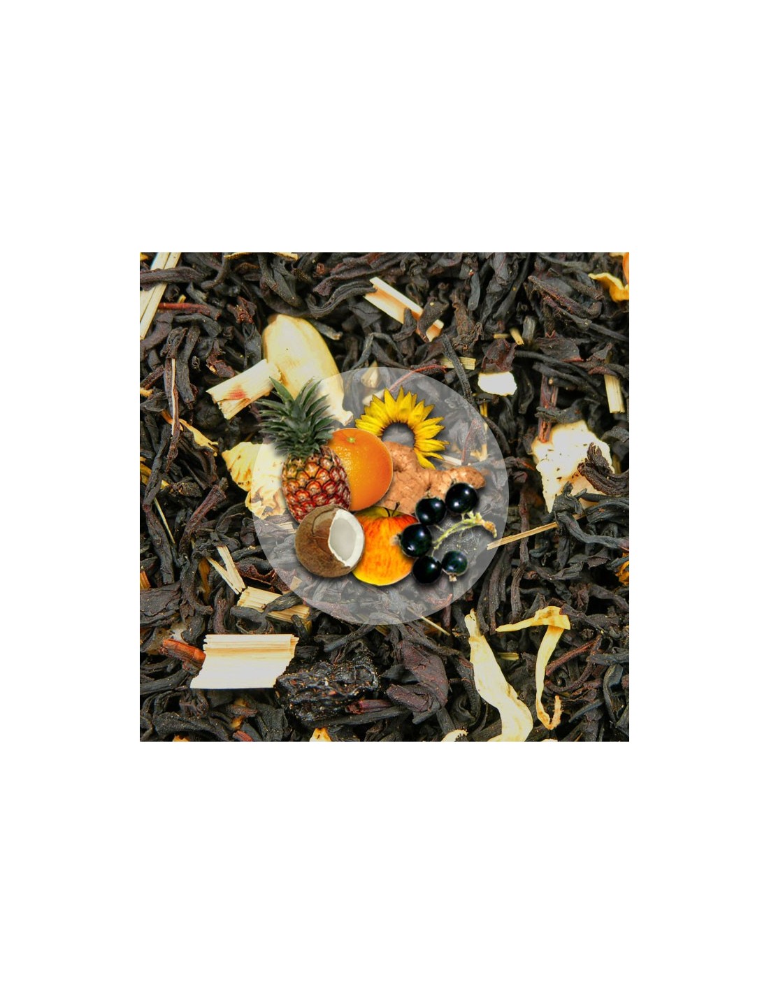 Herbata Powiew Wiosny to mieszanka herbat z dodatkiem ananasa, pomarańczy, kokosu, jabłka, czarnej porzeczki, imbiru, płatków słonecznika.