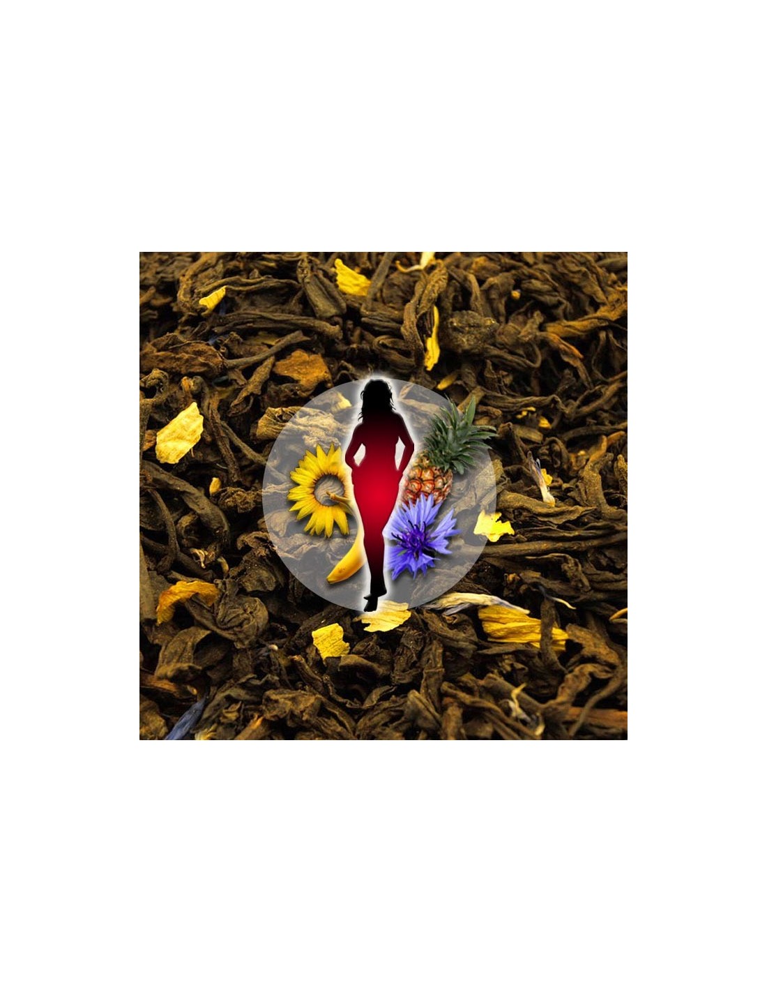 Czerwona herbata wspomaga pracę wątroby, obniża poziom cholesterolu, pobudza procesy trawienne i oczyszcza organizm, a przede wszystkim skutecznie walczy z nadwagą. Herbata czerwona African Queen zawiera dodatkowo ananas, banan, bławatek, płatki słonecznika, nasiona słonecznika.