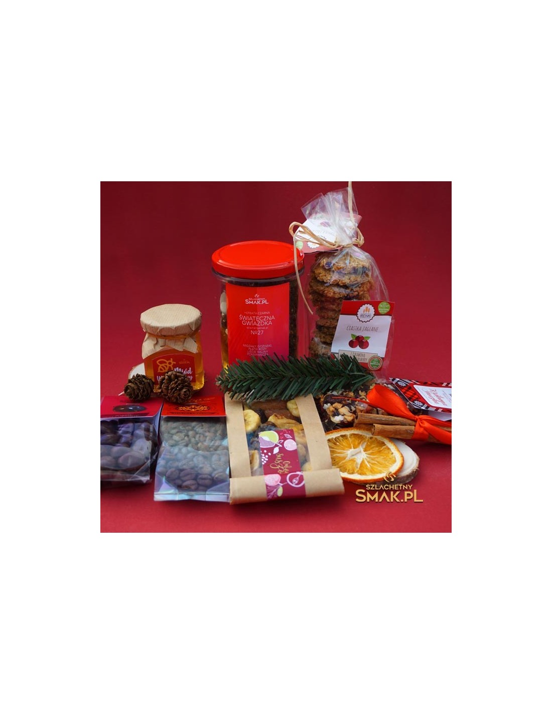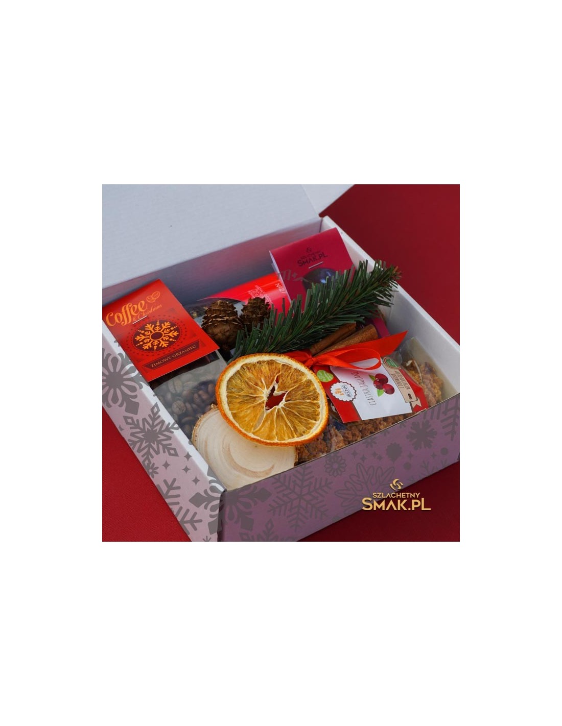 Zestaw doskonałych świątecznych smakołyków zamknięty w kartonowe pudełko. Prezent na święta