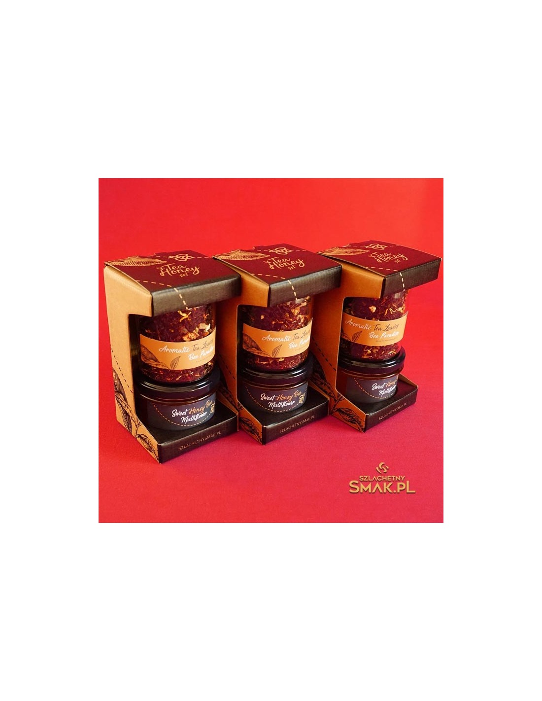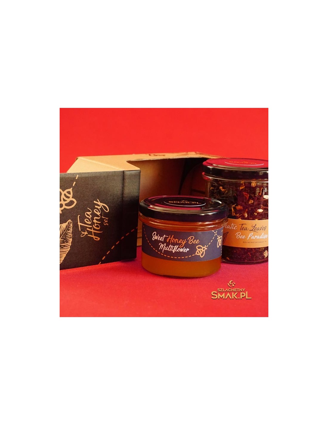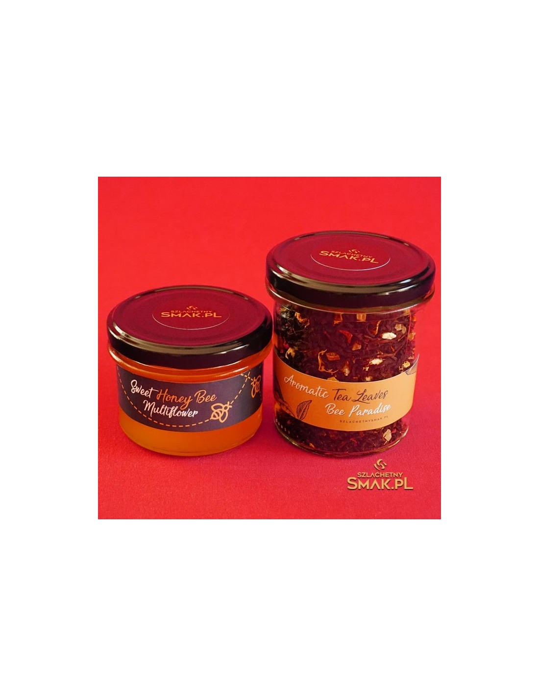Herbata z Miodem to gotowy zestaw prezentowy zapakowany w tekturowe opakowanie. Wewnątrz słoik czarnej herbaty Pszczeli Raj, oraz słoik prawdziwego polskiego miodu wielokwiatowego, (krystalizacja miodu jest prawidłowością). Przy większych zamówieniach niższa cena, a także możliwość personalizowanego opakowania i etykiet.