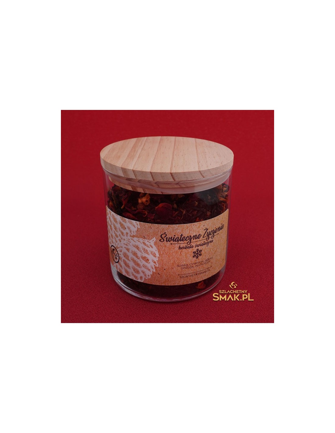 Świąteczne Życzenia dla wszystkich smakoszy herbat. To aromatyczna herbata z serii Przytulne Święta. W szklanym pojemniku czarna herbata z dodatkiem śliwki, jabłka, płatków róży, goździków, cynamonu. Super prezent na święta. Przy większych zamówieniach możliwość indywidualnej grafiki.