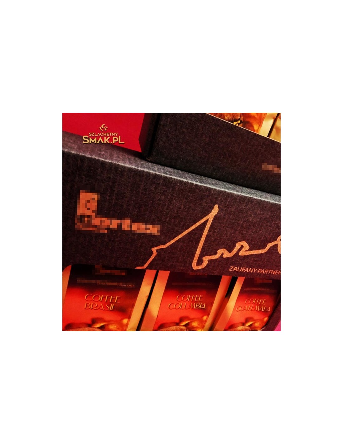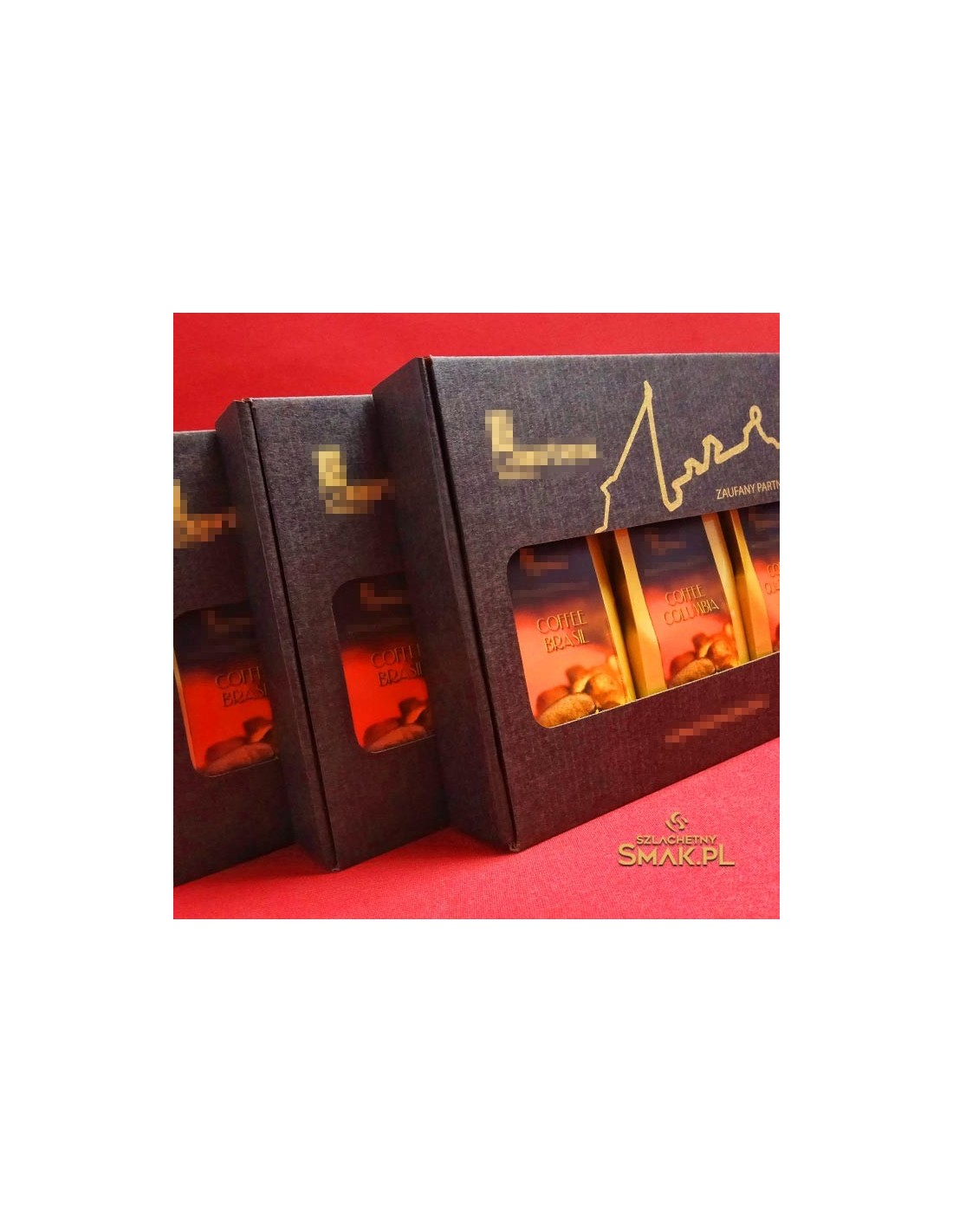 Zestaw kaw w pudełku kartonowym z okienkiem. Wykonany dla Klienta jako gadżet używany w kontaktach biznesowych. Użyte kawy to Brazylia, Kolumbia Gwatemala.