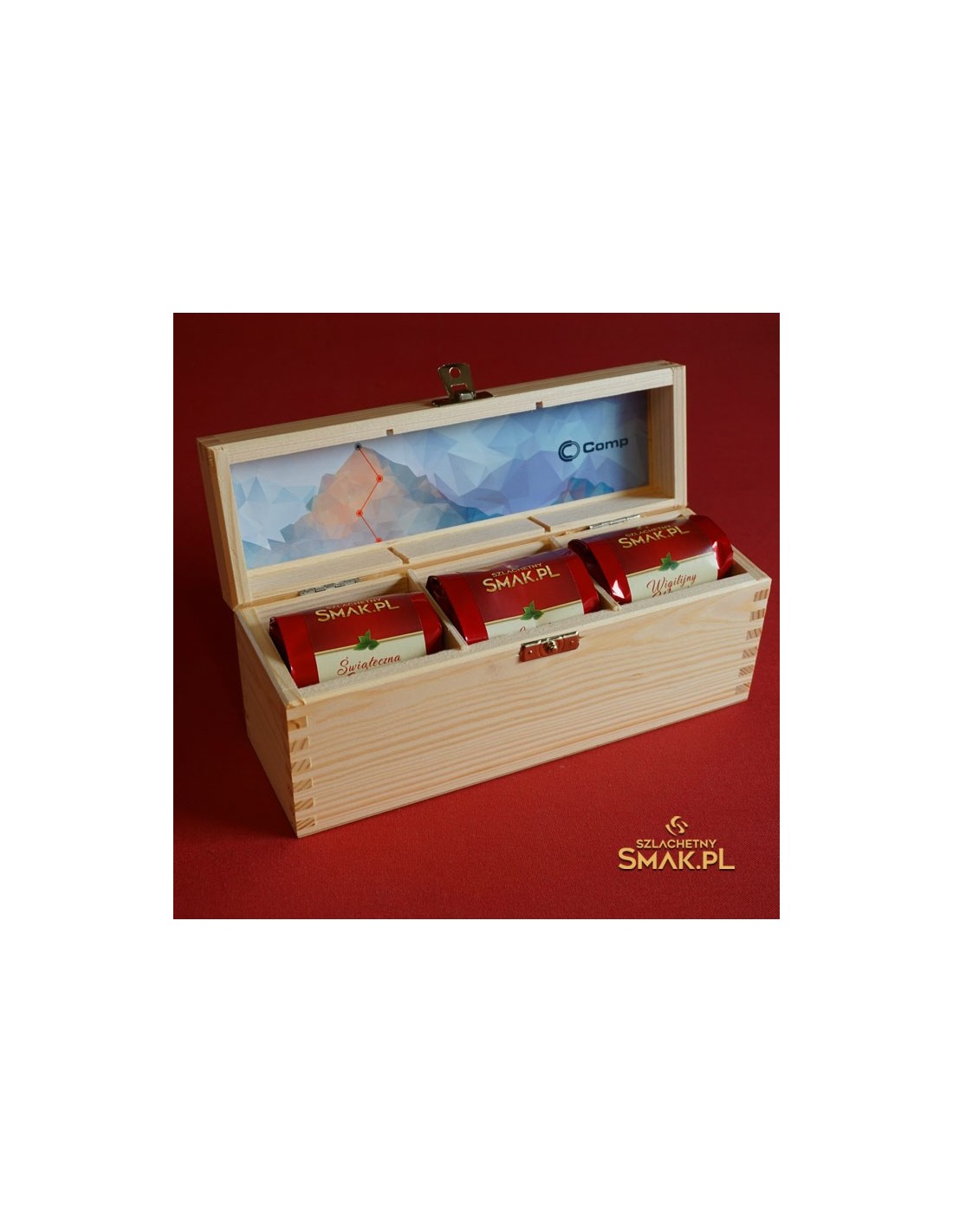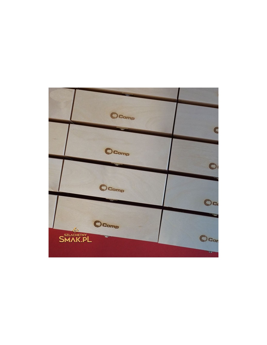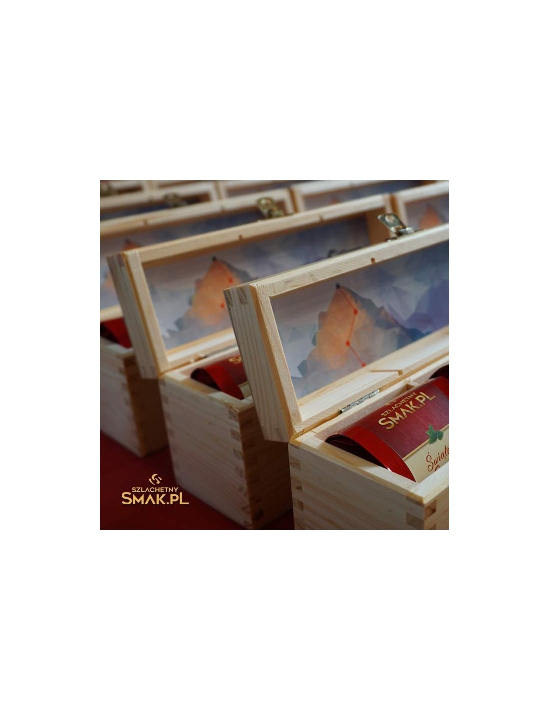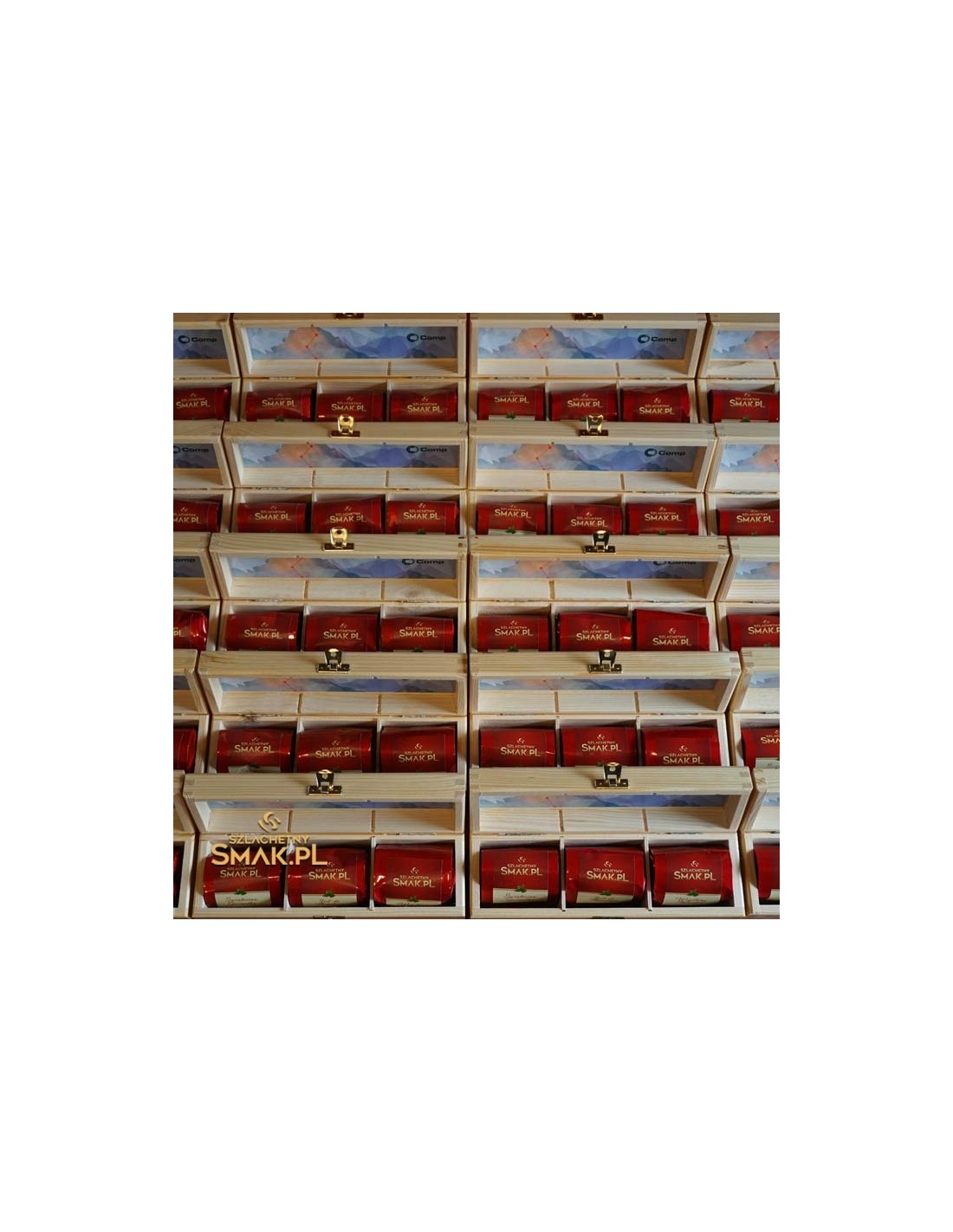 Seria drewnianych skrzyneczek z herbatami wykonana jako elegancki firmowy prezent. Tutaj w wersji jasnej, nie barwionej.