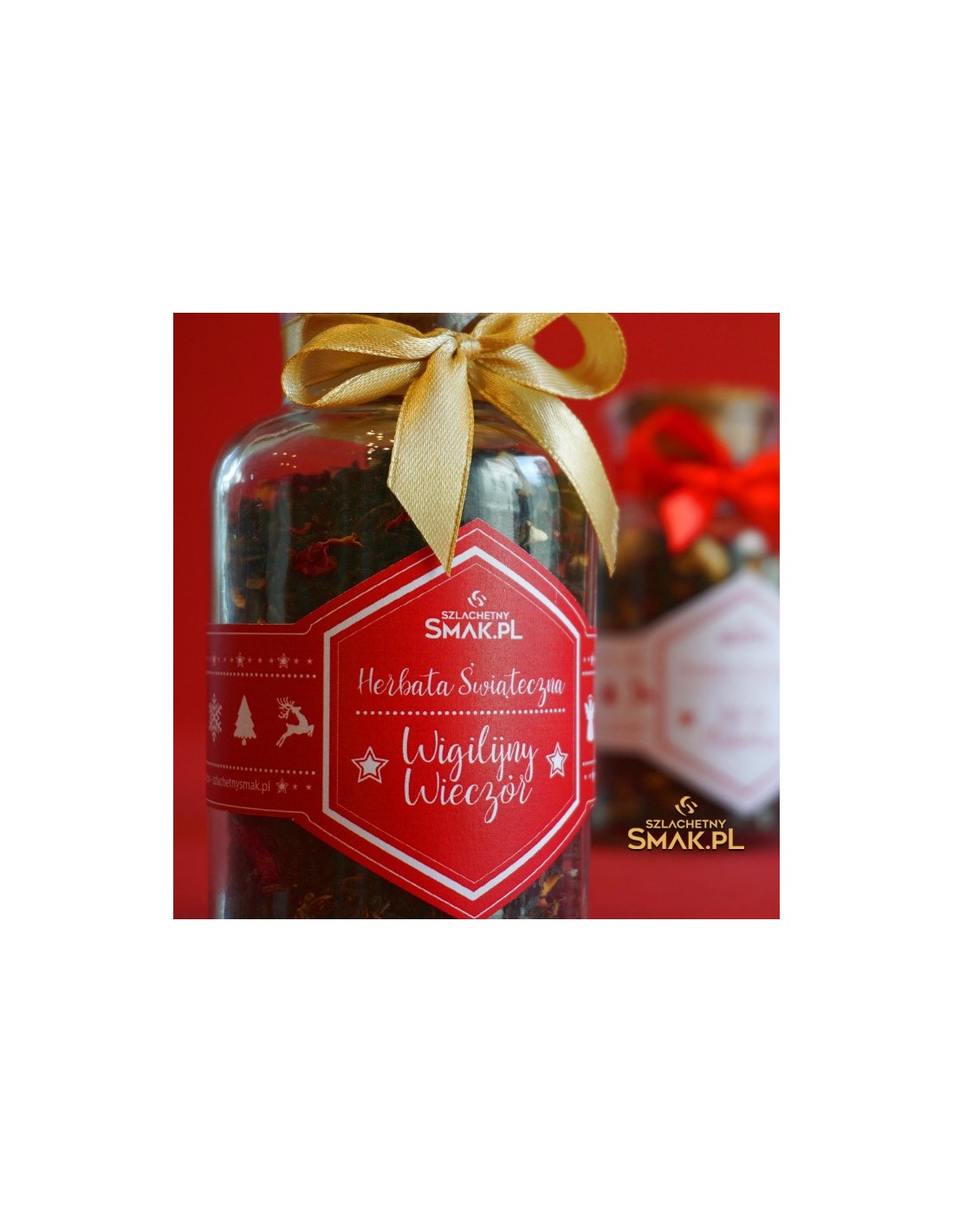 Elegancki szklany flakonik z korkiem z zawartością świątecznej herbaty Wigilijny Wieczór. Składniki herbaty typowo świąteczne: pomarańcza, migdały, cynamon, goździki, maliny, anyż, płatki róży, truskawki. Piękny gotowy podarunek świąteczny. Przy zamówieniach hurtowych niższe ceny.