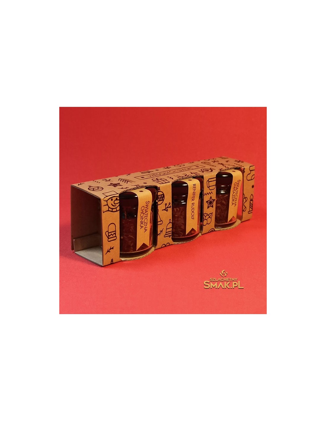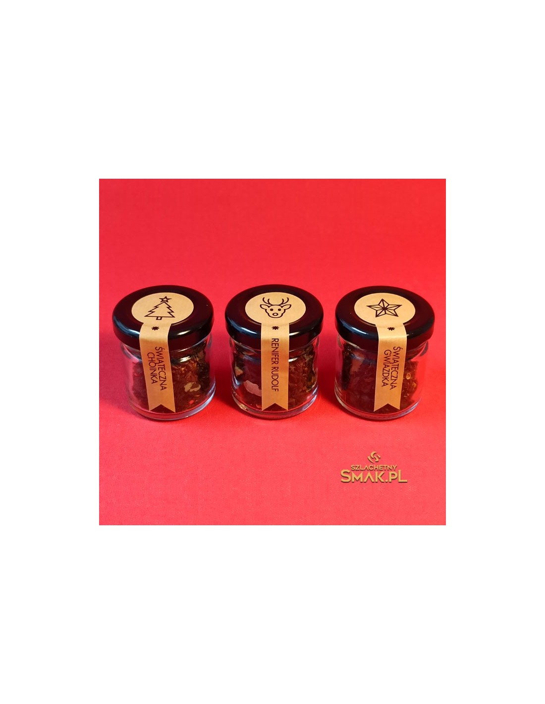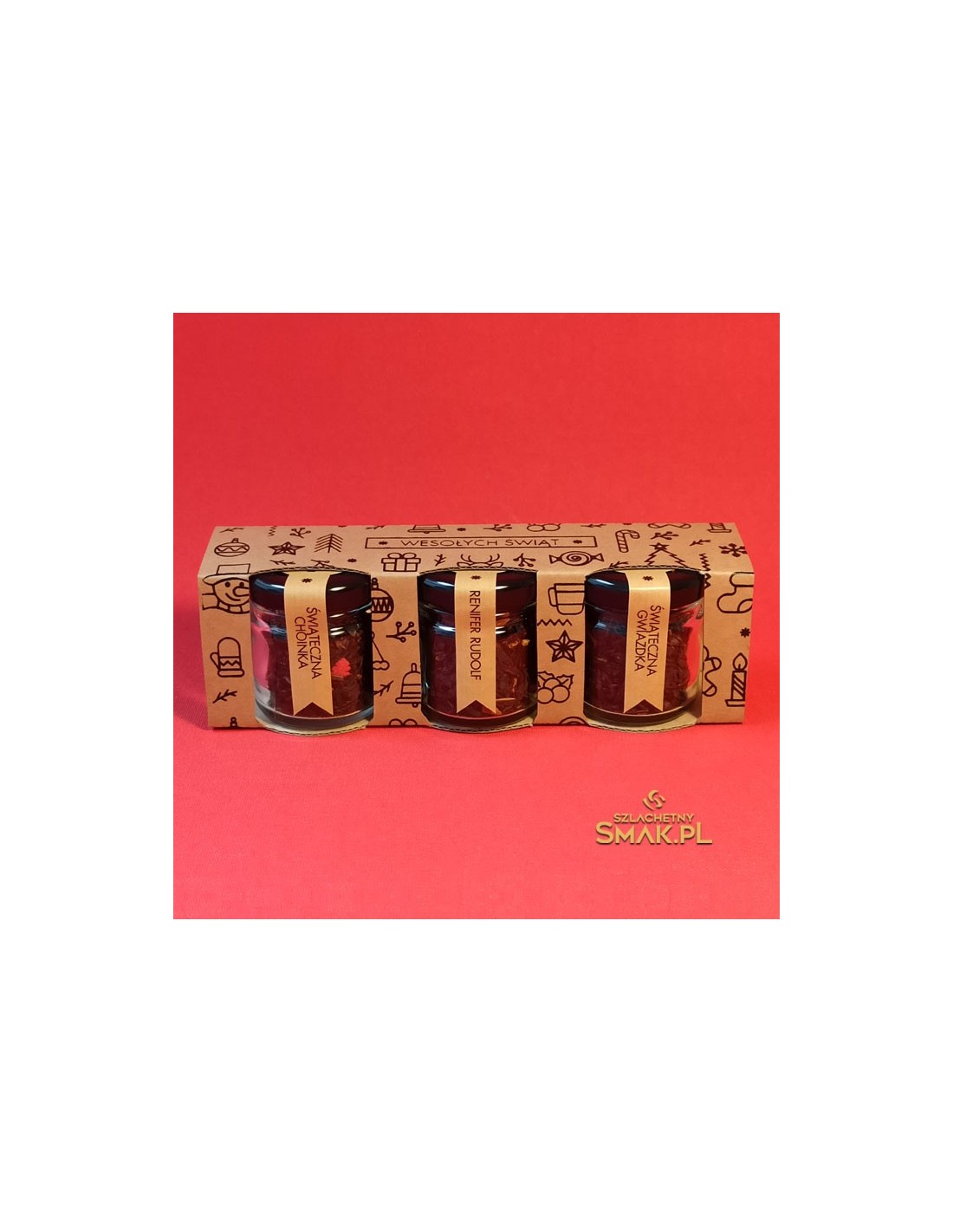 Zestaw małych słoiczków z herbatą świąteczną. Trzy herbaty, trzy smaki, trzy świąteczne życzenia. Pierwsze życzenie to Świąteczna Choinka - czarna herbata świąteczna z dodatkiem toffee, pomarańczy, wanilii, oraz dekoracji cukrowych. Drugie życzenie - Renifer Rudolf z dodatkiem jabłka, cynamonu, orzechów laskowych, migdałów, skórki pomarańczy. Trzecie bardzo ważne życzenie to Świąteczna Gwiazdka z dodatkiem migdałów, goździków, płatków róży, liści maliny, oraz pomarańczy. Podaruj bliskim Trzy aromatyczne życzenia...