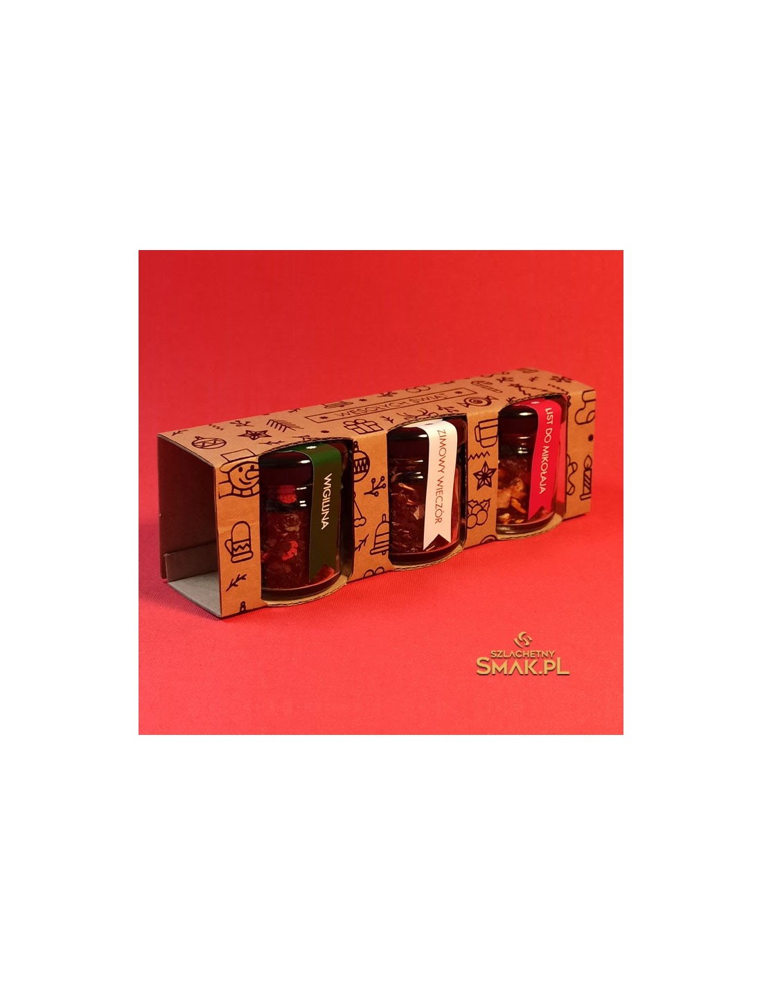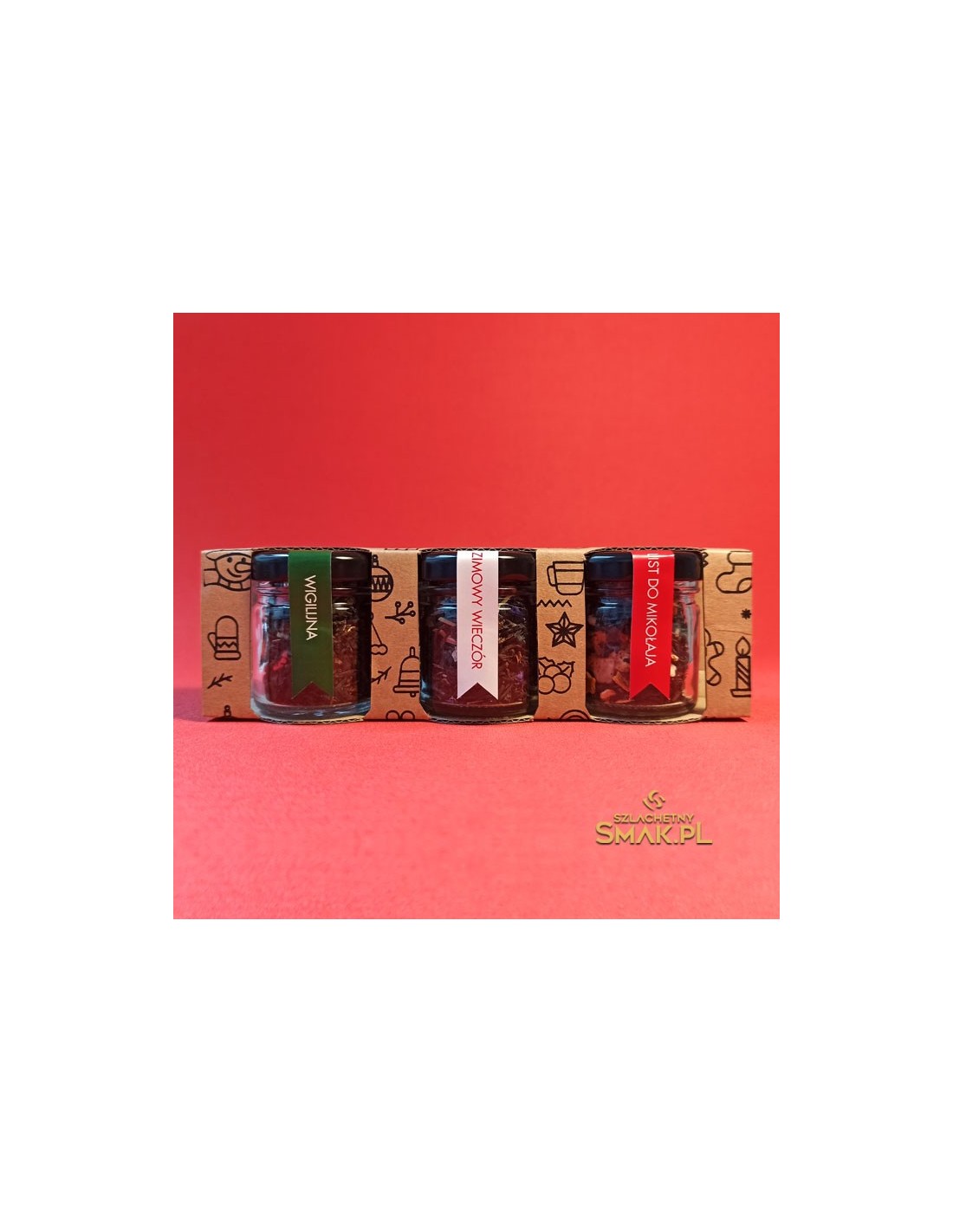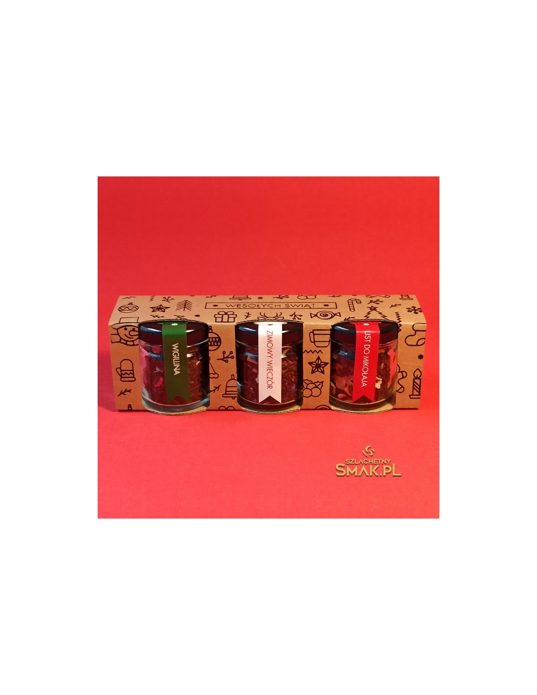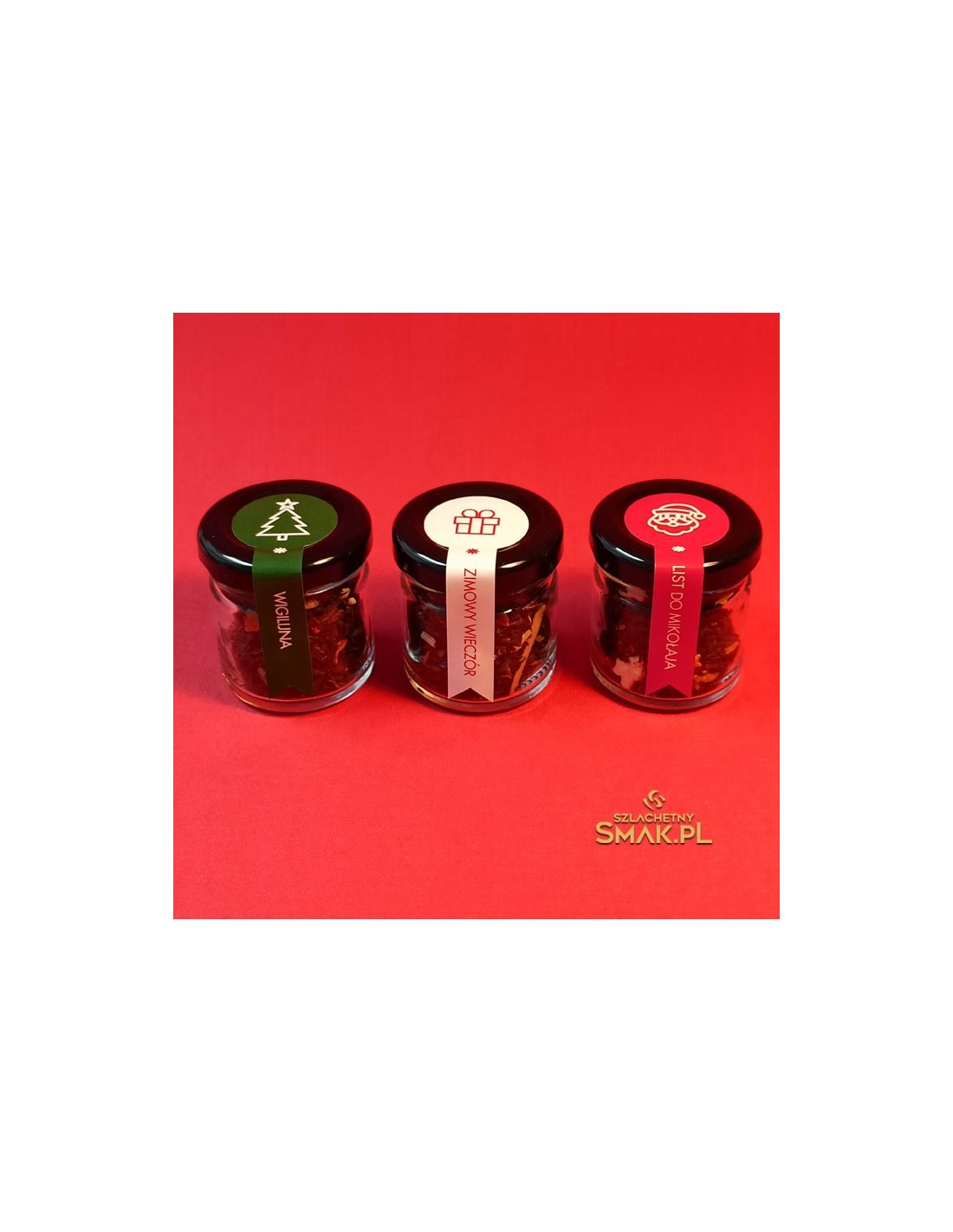 Zestaw trzech herbacianych życzeń ... w małych szklanych słoiczkach ukryte aromaty świąt. Wigilijna - herbata świąteczna z dodatkiem skórki pomarańczy, jabłka, maliny i dekoracji cukrowych. Kolejne życzenie to Zimowy Wieczór wraz z cytryną kandyzowaną, pestkami dyni, trawą cytrynową, liśćmi maliny, oraz bławatkiem. Ostatnie życzenie skierowane jest do Gościa z brodą .... List do Mikołaja, a w nim papaja, jabłko, rodzynki, skórka pomarańczowa, żurawina, truskawki, czekolada i cukrowe dekoracje. Czujesz już tą świąteczną atmosferę ?