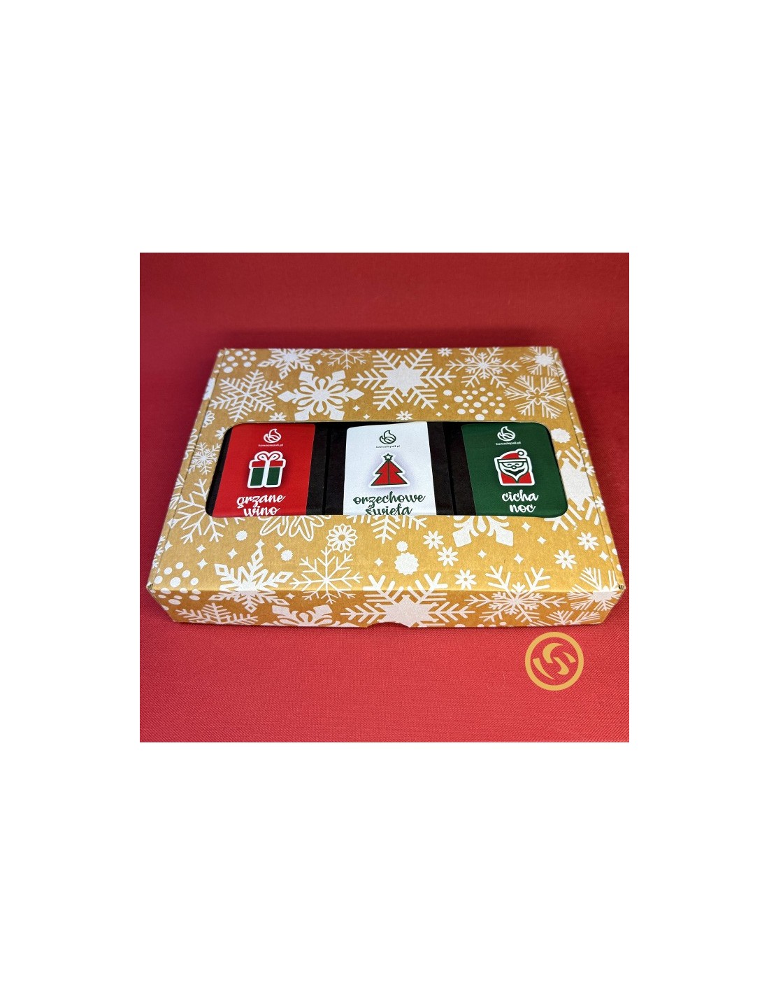 Elegancki zestaw trzech świątecznych kaw o wyjątkowych smakach i aromatach. Idealny prezent, który wprowadzi do domu zapach cynamonu, pomarańczy i orzechów.
