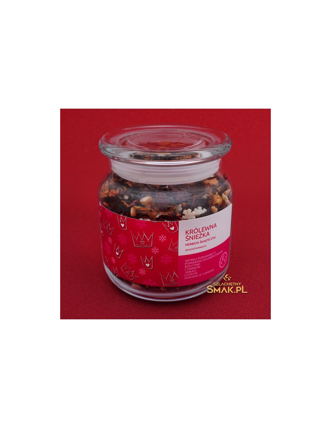 Owocowa herbata - Królewna Śnieżka to herbata świąteczna pełna dodatków takich jak: hibiskus, skórka róży, jabłko, pomarańcza kandyzowana, migdały, żurawina, cynamon, nagietek. Dopełnieniem są dekoracje cukrowe. W serii Szklana Śnieżynka herbata zapakowana jest szczelnie w szklany pojemnik.