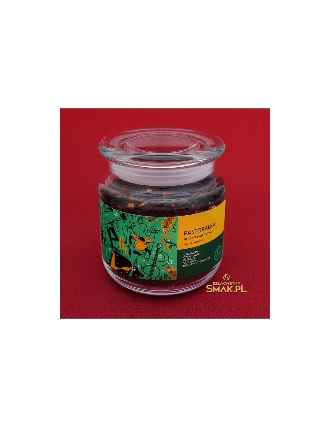 Pastorałka to czarna herbata świąteczna z linii herbat Szklana Śnieżynka. Znajdziesz tu pyszne dodatki takie jak cynamon, czekolada, goździki, szafran i dekoracje cukrowe. Piękny prezent na święta, zapakowany w szklany, szczelnie zamknięty pojemnik. Duża porcja 140g.