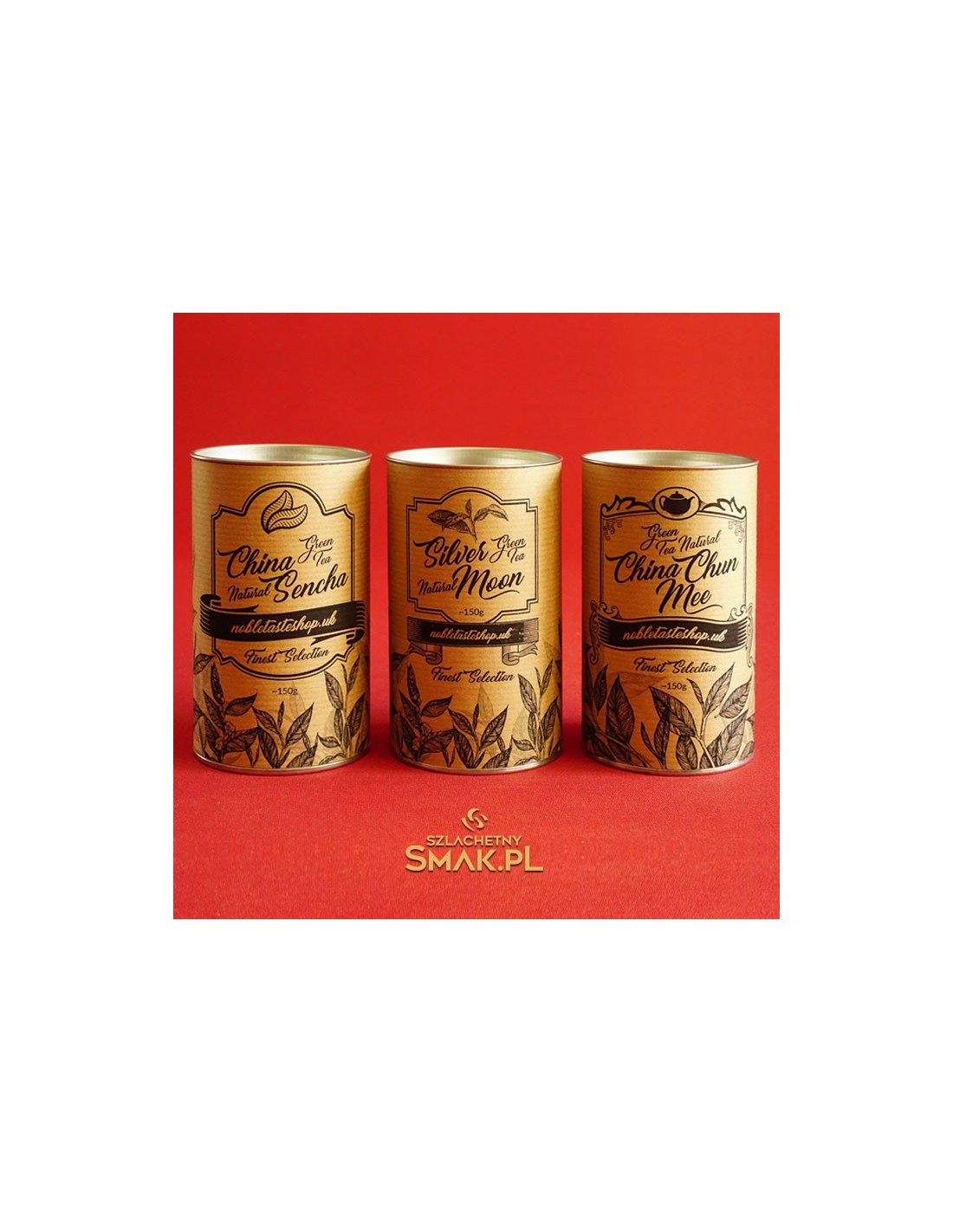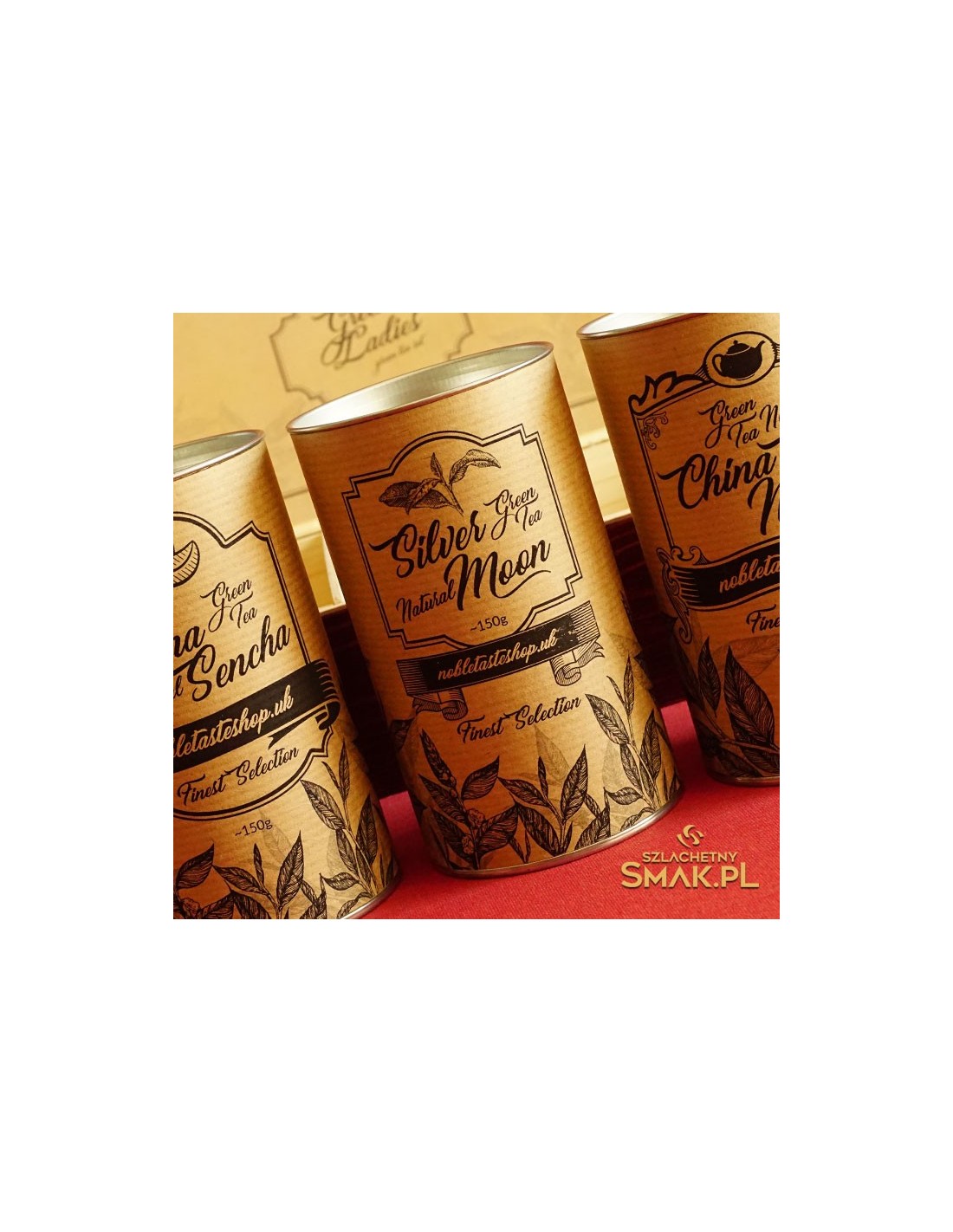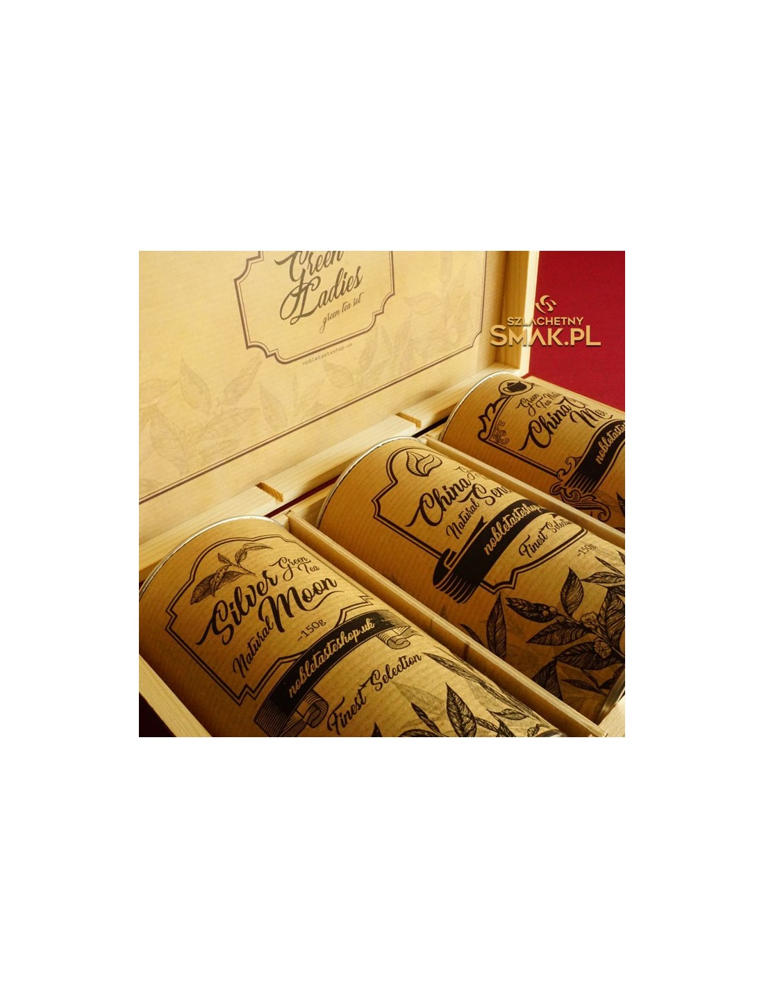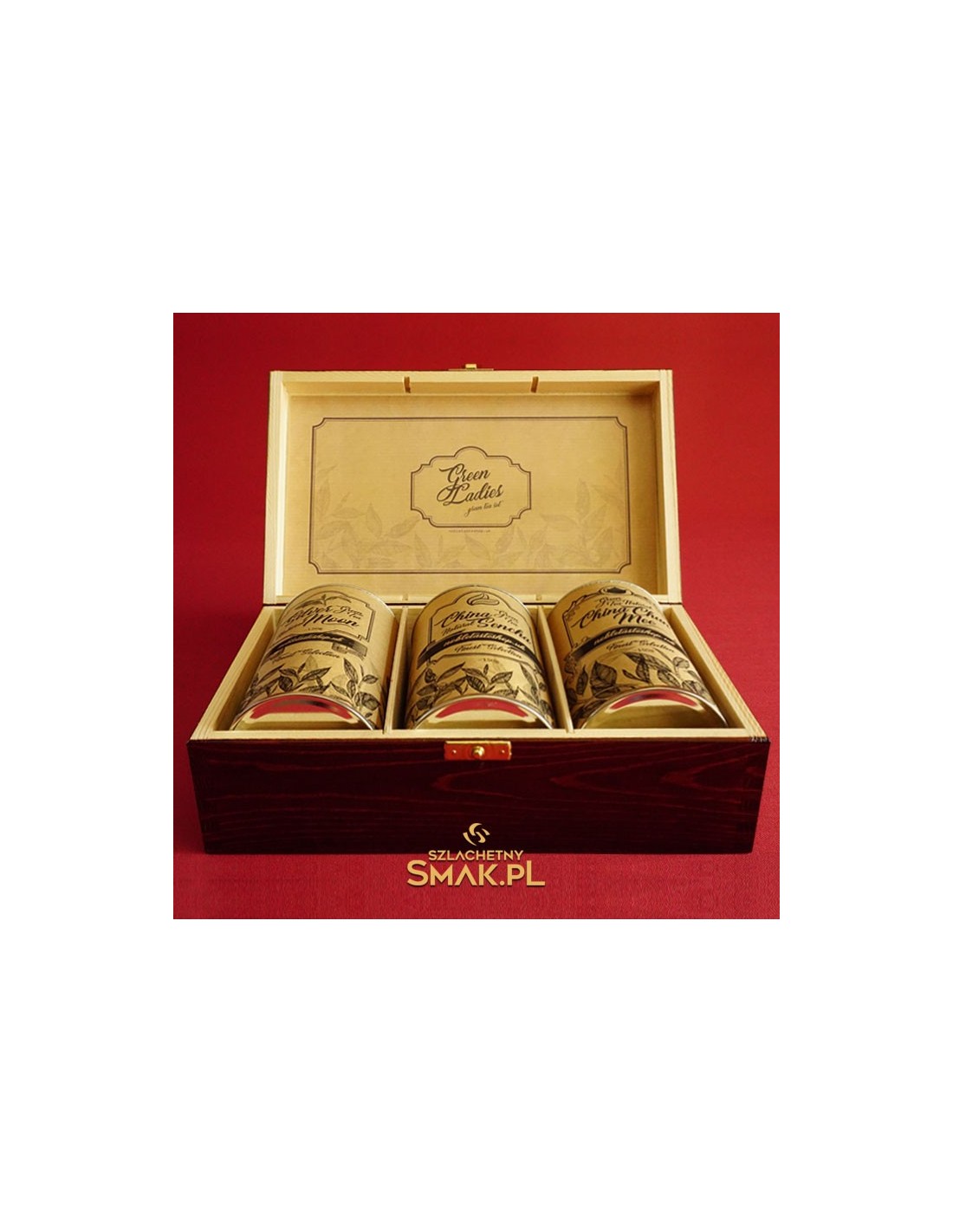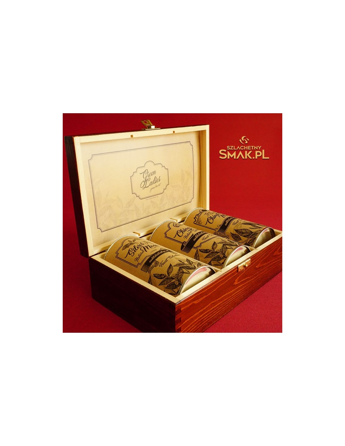 Elegancka drewniana kasetka, a wewnątrz trzy duże puszki wypełnione wyśmienitą zieloną herbatą, każda po ok.150g. Jest to doskonała forma ekskluzywnego gadżetu firmowego. Możemy wygrawerować na wieczku logo firmy, a także dopasować grafikę etykiet. Przy większych zamówieniach niższe ceny.