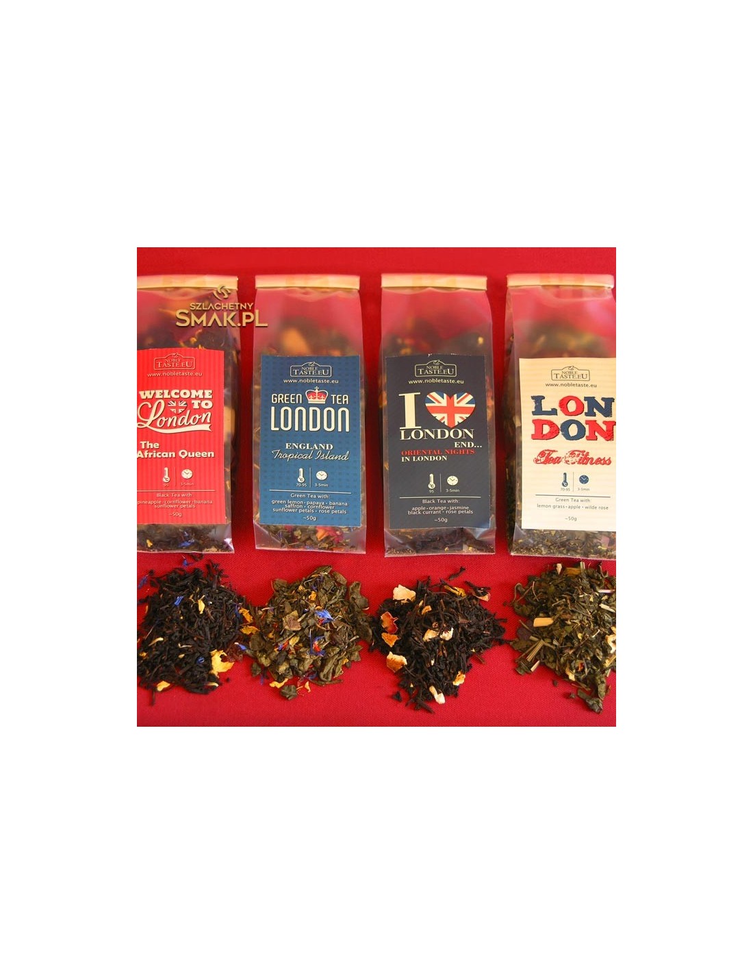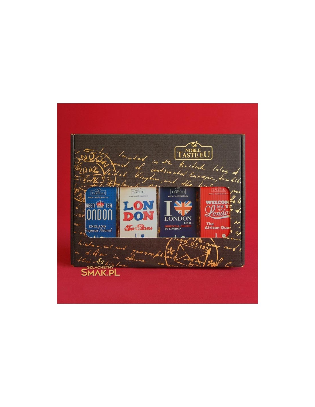 Przesyłka z Londynu to aromatyczny zestaw herbat zapakowanych w tekturowe pudełko z okienkiem. Wewnątrz zestawu znajdują się dwie herbaty zielone i dwie herbaty czarne.