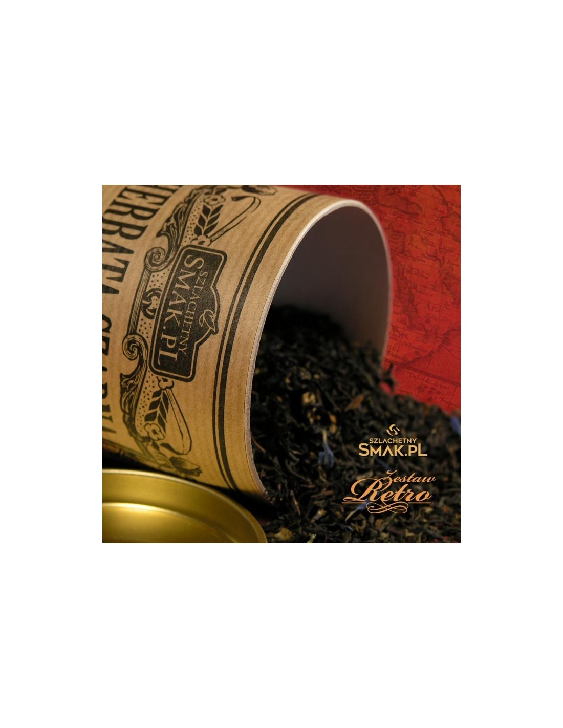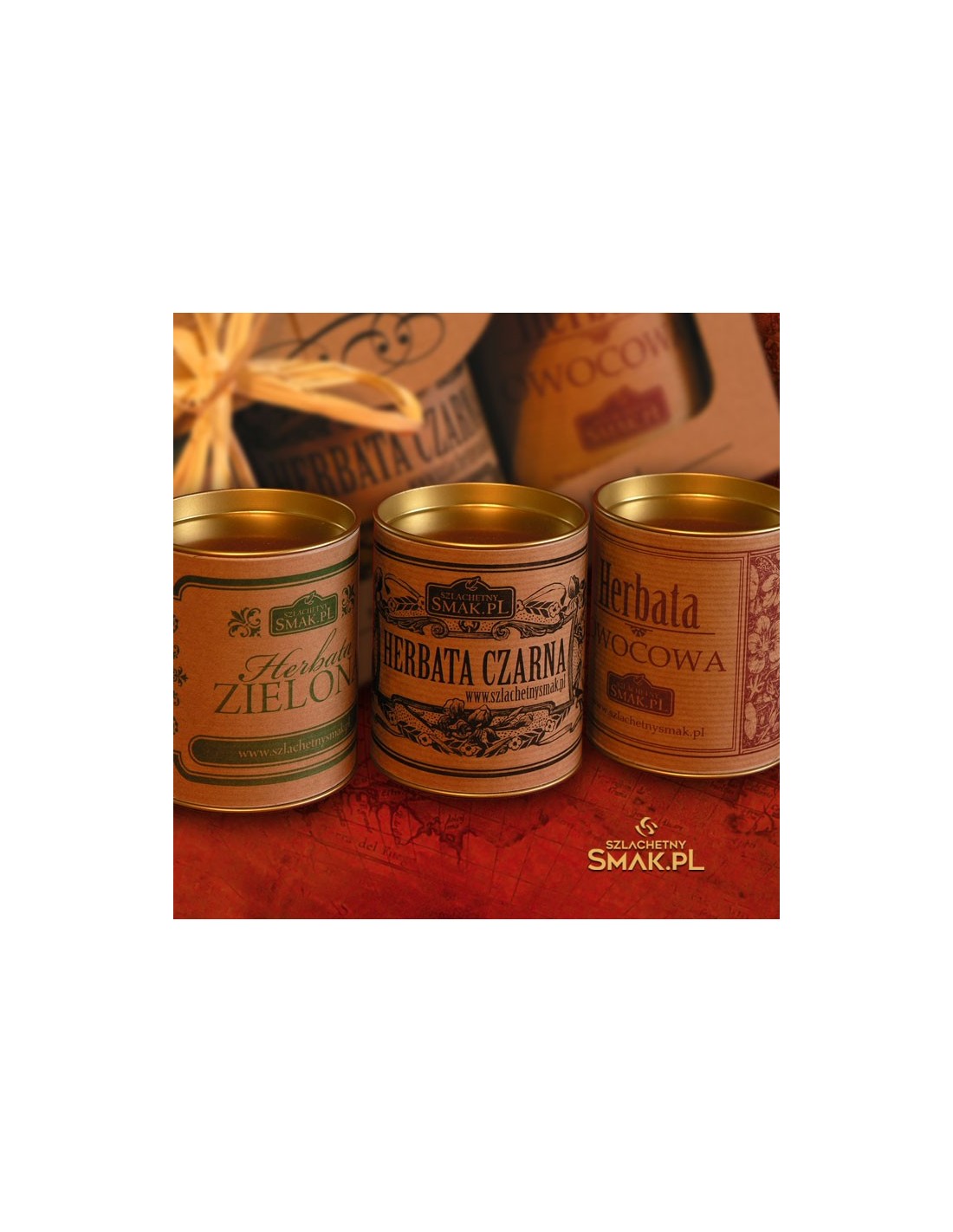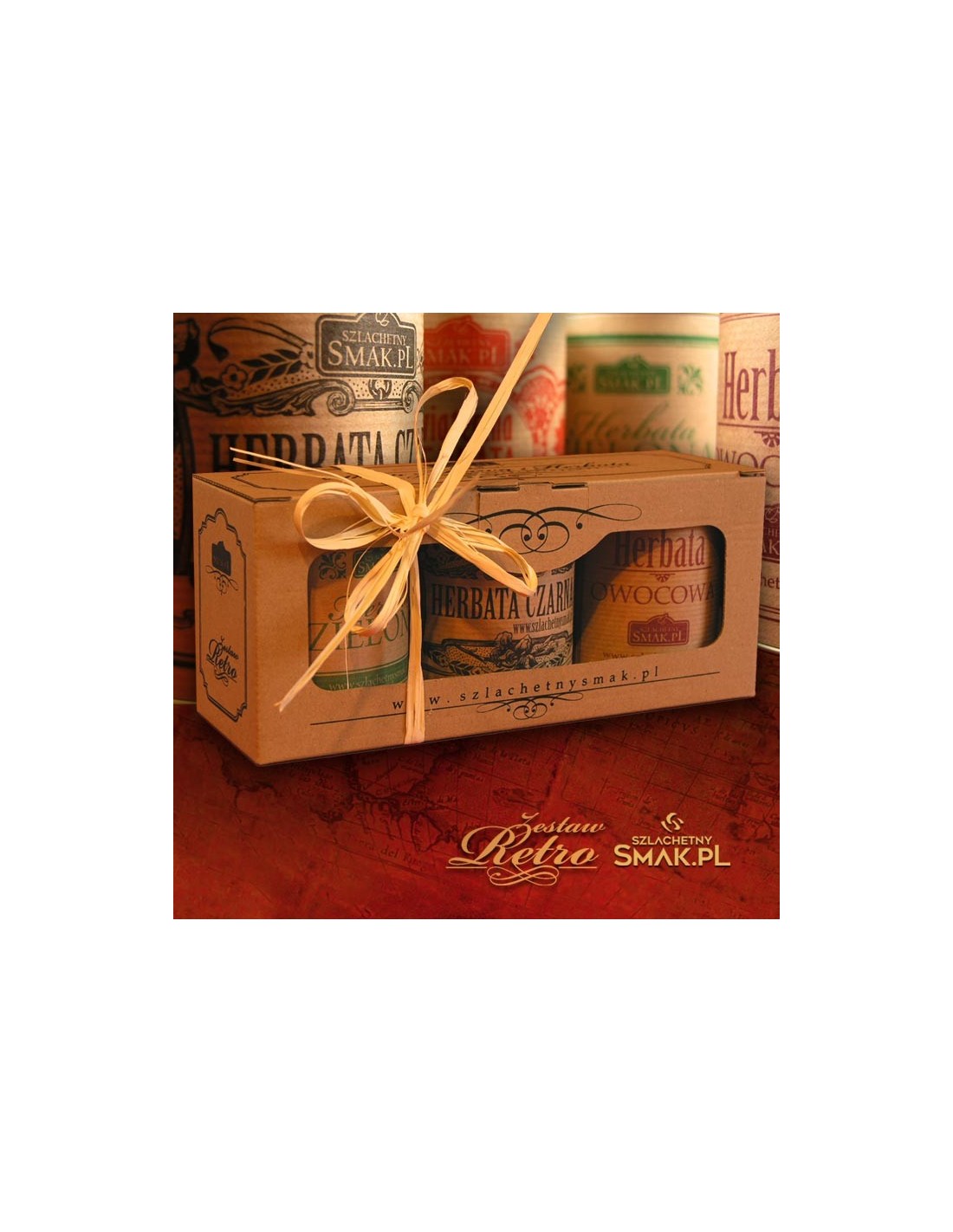 Trzy puszki, zamknięte w estetycznym pudełku, kryją w sobie wysokiej jakości herbaty: zieloną, czarną i owocową. Wszystkie z wymienionych herbat mają pozytywny wpływ na nasze zdrowie oraz – co ważniejsze – wyróżniają się znakomitym smakiem i aromatem. Nie trzeba być wytrawnym smakoszem, aby zauważyć, że smakują one zupełnie inaczej, niż herbaty, które pijemy na co dzień – ale wytrawni smakosze również znajdą w nich rarytasy godne najwybredniejszego podniebienia.Całość zestawu zaaranżowana została na styl kolonialny: puszki zyskały etykiety z ornamentami, a pudełko z okienkiem przewiązane jest wstążką z rafii. To nie przypadek, że ten elegancki upominek pojawia się w ofercie szlachetnysmak.pl właśnie teraz. Pretekstem do opracowania Zestawu Retro jest moda na dekoracje, ozdoby i meble w starym stylu, która nigdy nie przemija, a w ostatnim czasie przebojem powróciła na szczyty popularności.Doskonały na gadżet biznesowy. Rodzaje herbat do uzgodnienia. Grafika może być wg sugestii klienta- czarna herbata ~70g- zielona herbata ~70g- owocowa herbata ~100g