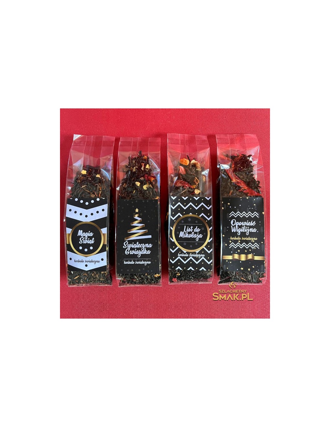 Świąteczna gwiazdka - czarna herbata z dodatkiem goździków, płatków róży, migdałów, suszonej skórki pomarańczy.