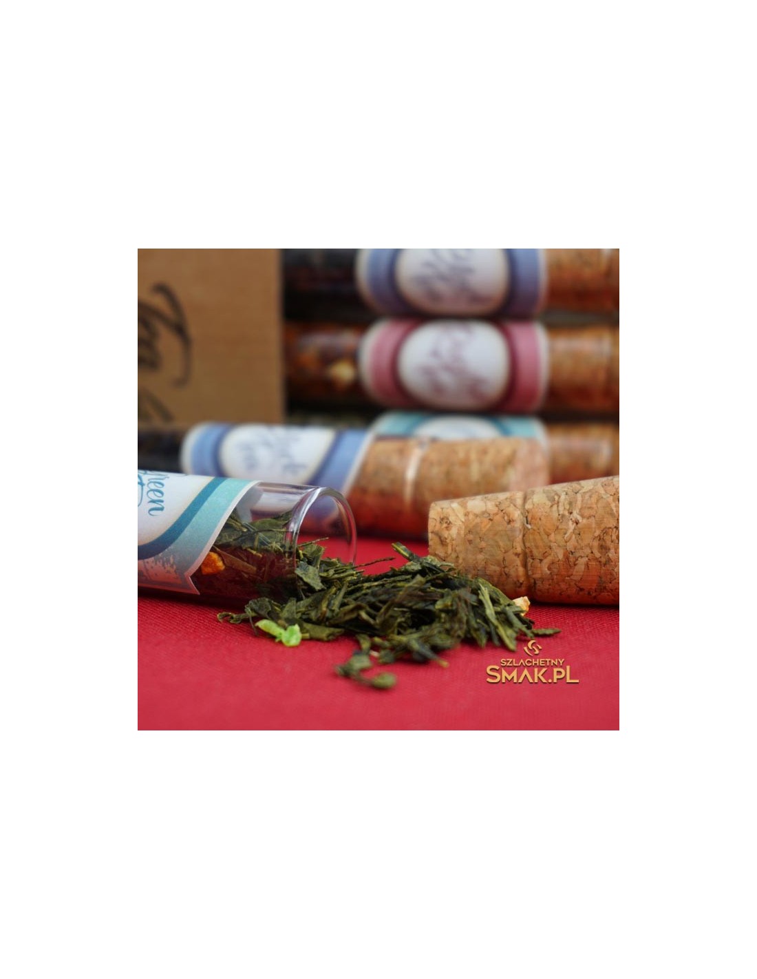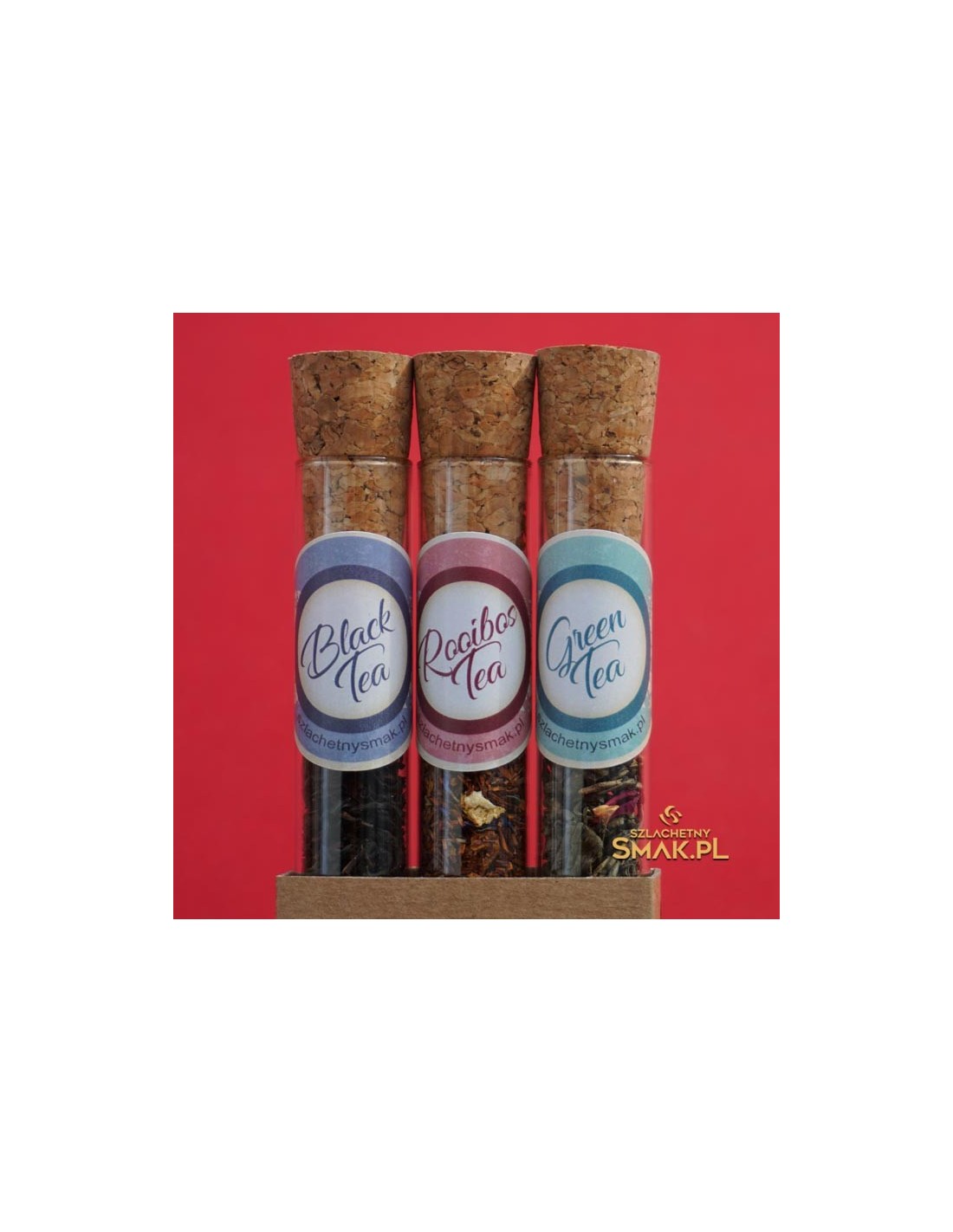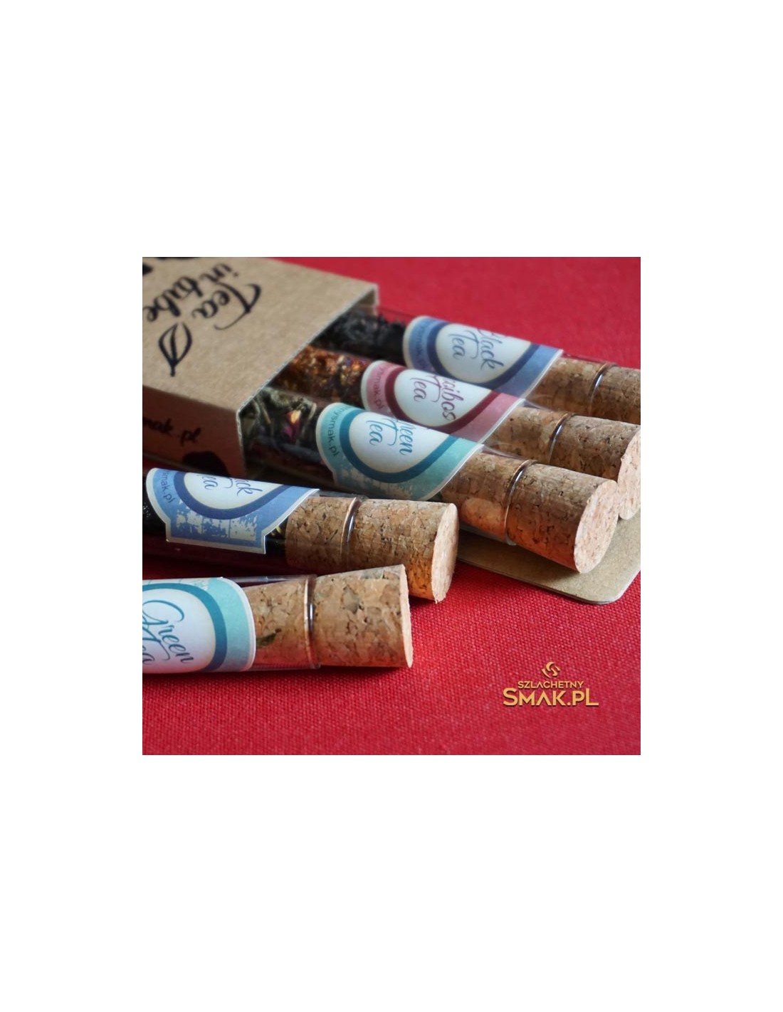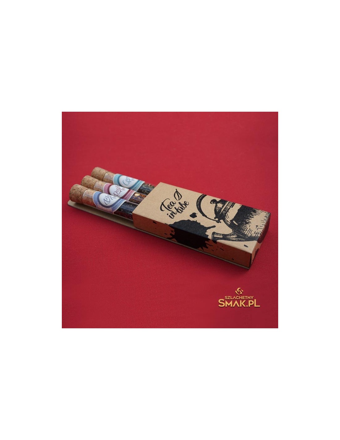 Herbata w szklanych rurkach "Tea in tube". Zestaw trzech rodzajów herbat: czarnej, zielonej i rooibos zapakowanych w szklane rurki, szczelnie zamknięte korkiem. Elegancki i szlachetny w odbiorze gadżet firmowy.