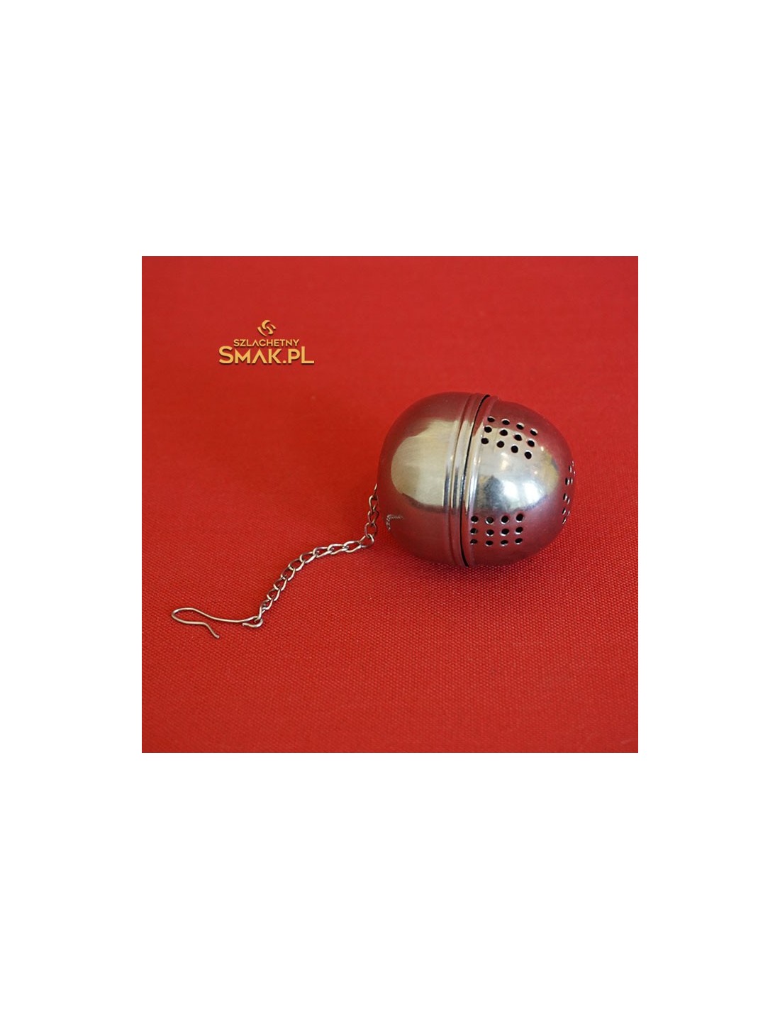 Metalowa zaparzaczka do herbaty w kształcie jajka.
