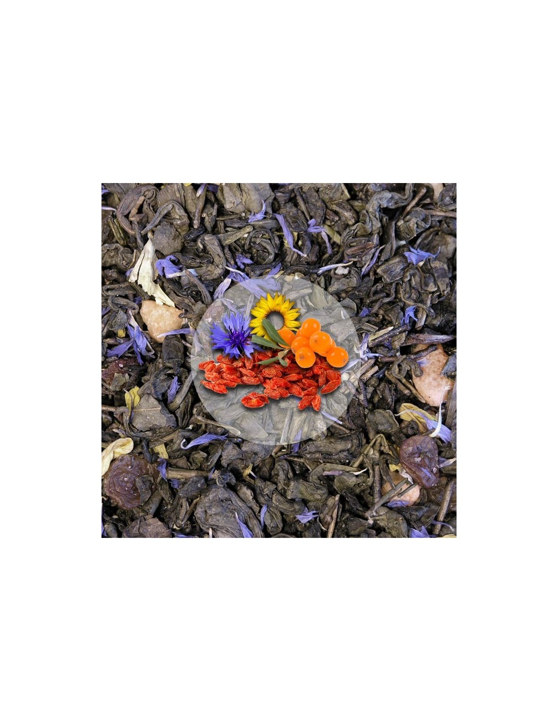 Czerwony Diament to zielona herbata o wyrafinowanym smaku i aromacie. Posiada wiele dodatków takich jak: rokitnik, jagody goji, liść maliny, czarną porzeczkę i cukier witaminowy.