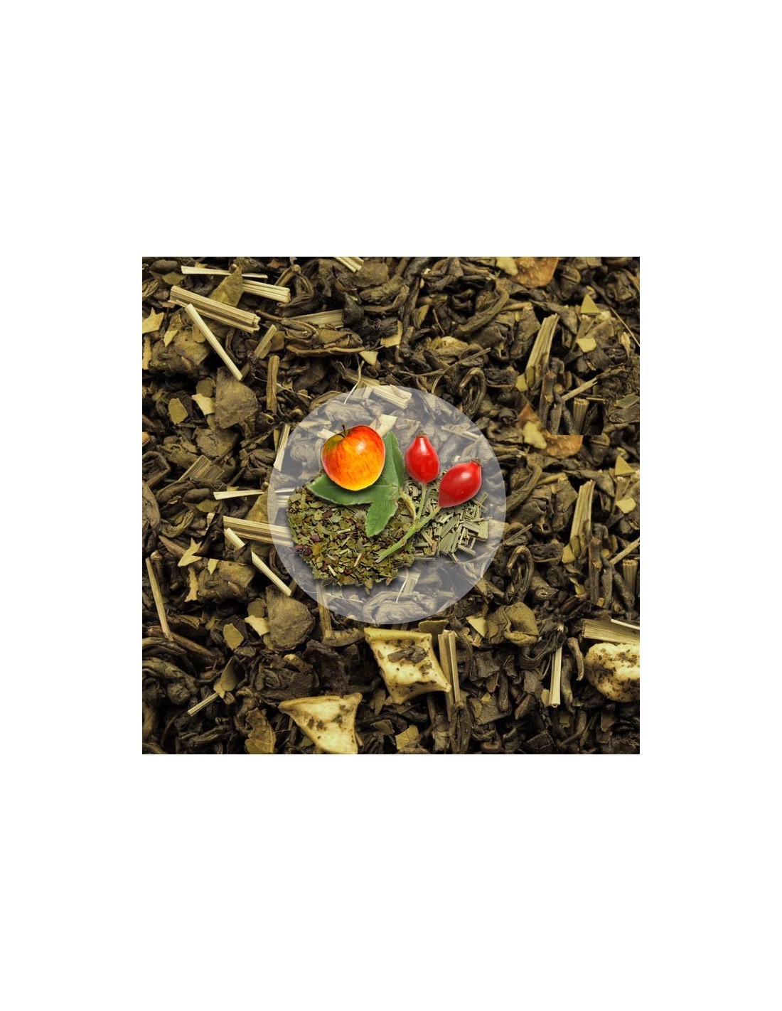 Zielona Herbata Fitness jak sama nazwa wskazuje pomaga w odchudzaniu, a rewelacyjny smak i aromat zapewniają dodatki: jabłka, yerba mate, skórka róży i trawy cytrynowej.