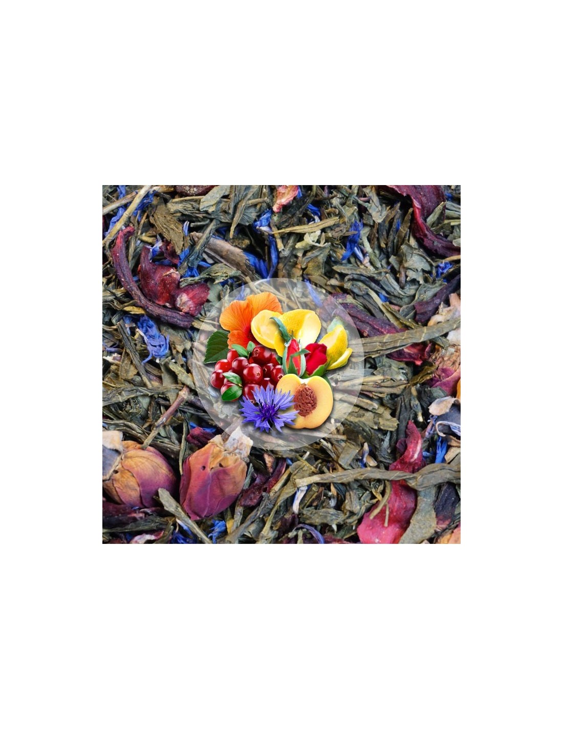 Zielona Przystań to aromatyczna mieszanka zielonych herbat z dodatkiem hibiskusa, żurawiny, skórki cytryny, mango, pączków róży, bławatka oraz brzoskwini.